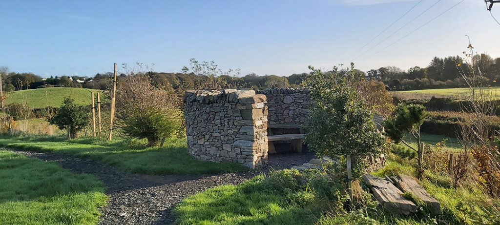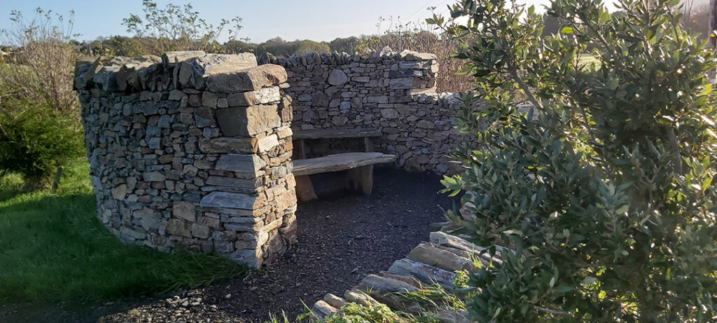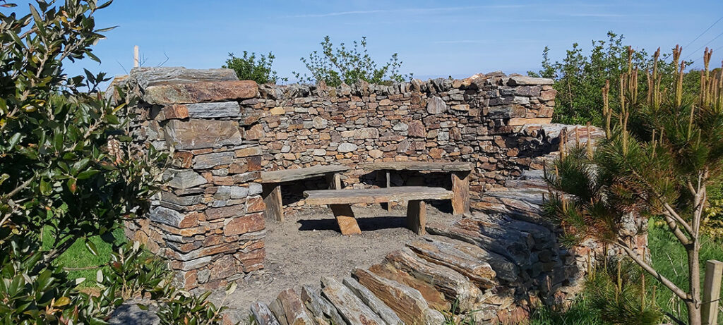 This dry-stone circular shelter was constructed by Neil Bell, using Manx Slate carefully selected by Michael Craig, late husband of one of AFD’s Finance team, and former technician at Earystane Quarry near Colby on the Isle of Man.